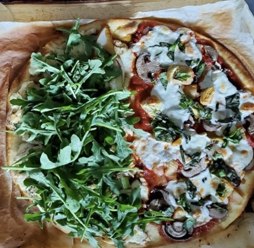 Just assemble ingredients in order, adding a little more or a little less depending on your preference. Bake according to the dough’s direction but generally 15-20 minutes for a thin crust pizza. Add fresh basil to the Margherita side and TONS of arugula to the pear side before serving. Enjoy!