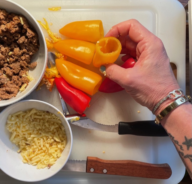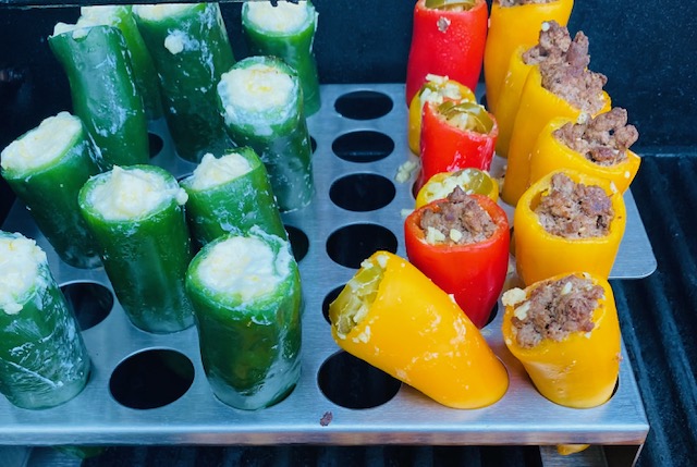 Cook sausage on stove top until browned, set aside. To prep the jalapenos, remove the stem and carefully use a small spoon (or corer if you have one) to remove the insides including all the seeds. For the stuffing, whip together the cream cheese and shredded cheese in a food processor until, well, until whipped. Then, one at a time, stuff with a little of the sausage, then cheese mixture, then sausage. Note, I do some with just the cheese and add pickled jalapenos to the top. I know. I’m crazy that way. Place into the aforementioned handy dandy gadget and grill over medium high heat for 10 minutes. Enjoy!