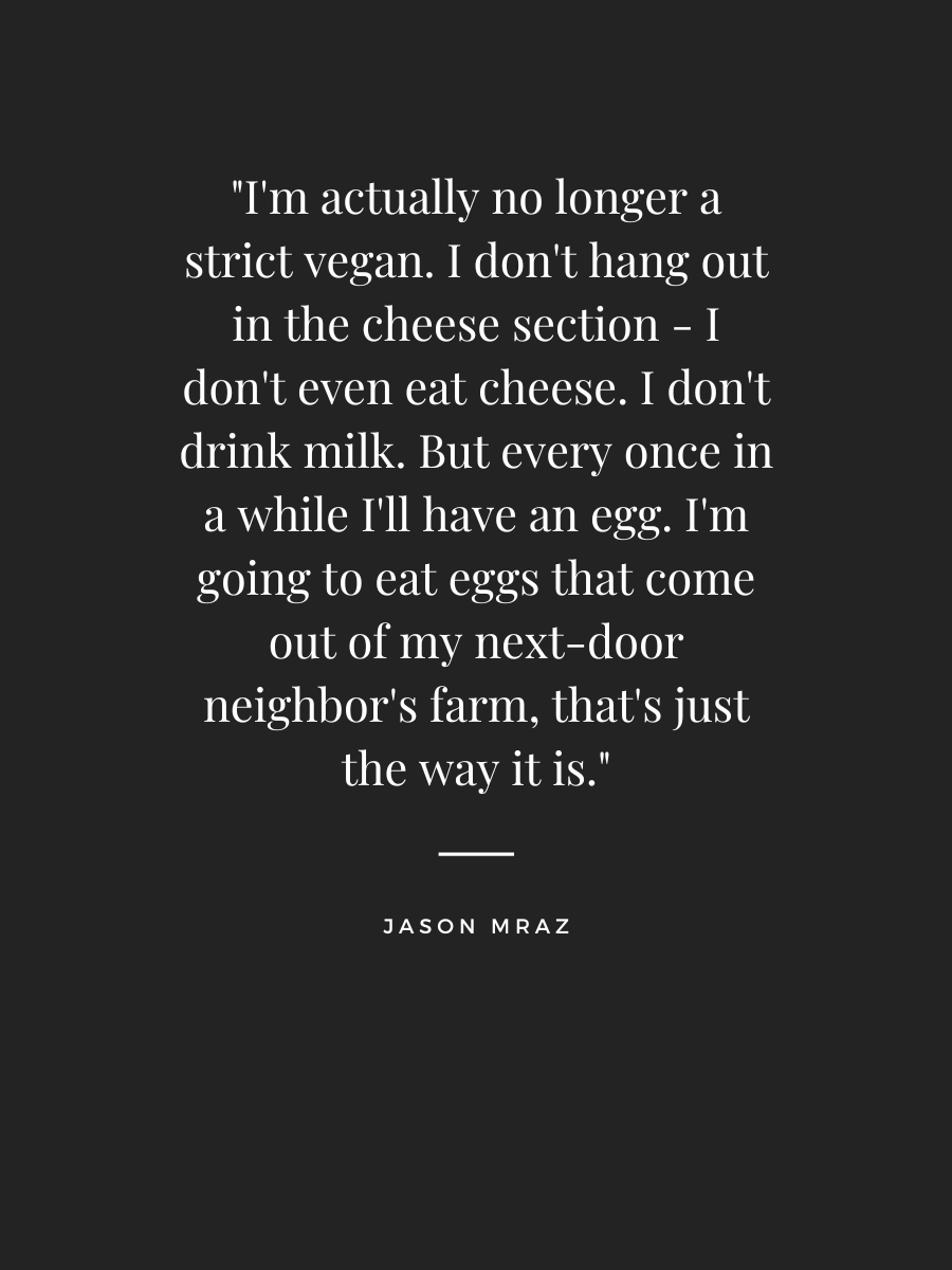 “I’m actually no longer a strict vegan. I don’t hang out in the cheese section – I don’t even eat cheese. I don’t drink milk. But every once in a while I’ll have an egg. I’m going to eat eggs that come out of my next-door neighbor’s farm, that’s just the way it is.” ~ Jason Mraz