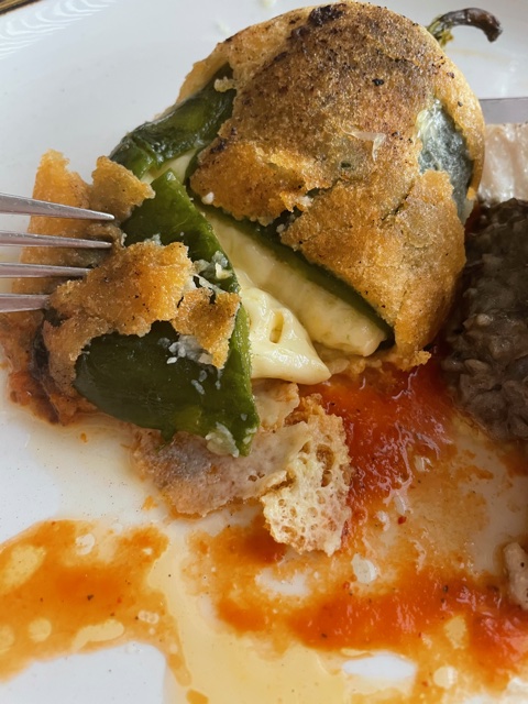 The first time I ordered a chili relleno in a restaurant I was hooked. It was at a small, family-owned (aka authentic) Mexican restaurant in a collegetown that has long since closed down, but none the same, the experience had me at hello. Or first bite, I guess. Anyhoo, it was a rather large chili, with a sauce akin to red enchilada sauce, but different. It was coated (as are most) with a nicely browned breading and oozed Monterey jack cheese when I cut into it. Needless to say, I’ve been ordering them ever since.