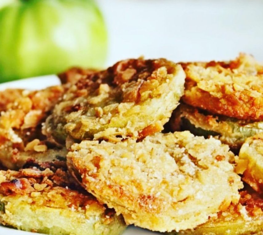 Rinse tomatoes and gently dry them. Cut tomatoes into ⅓-inch-thick slices. For the coating: In one bowl combine equal amounts cornmeal and flour and a dash of salt and cayenne pepper. In another bowl, combine two eggs with ½ cup plant-based milk. Dip sliced tomatoes into the dry mix, then wet and then dry again. Note, sometimes people sprinkle a little sugar on the tomato before dredging in the flour and egg mixture to cut down on the bitterness. Just know that the most important thing is to dip the tomato in the flour, then egg and flour again. There has to be a thick coating created.