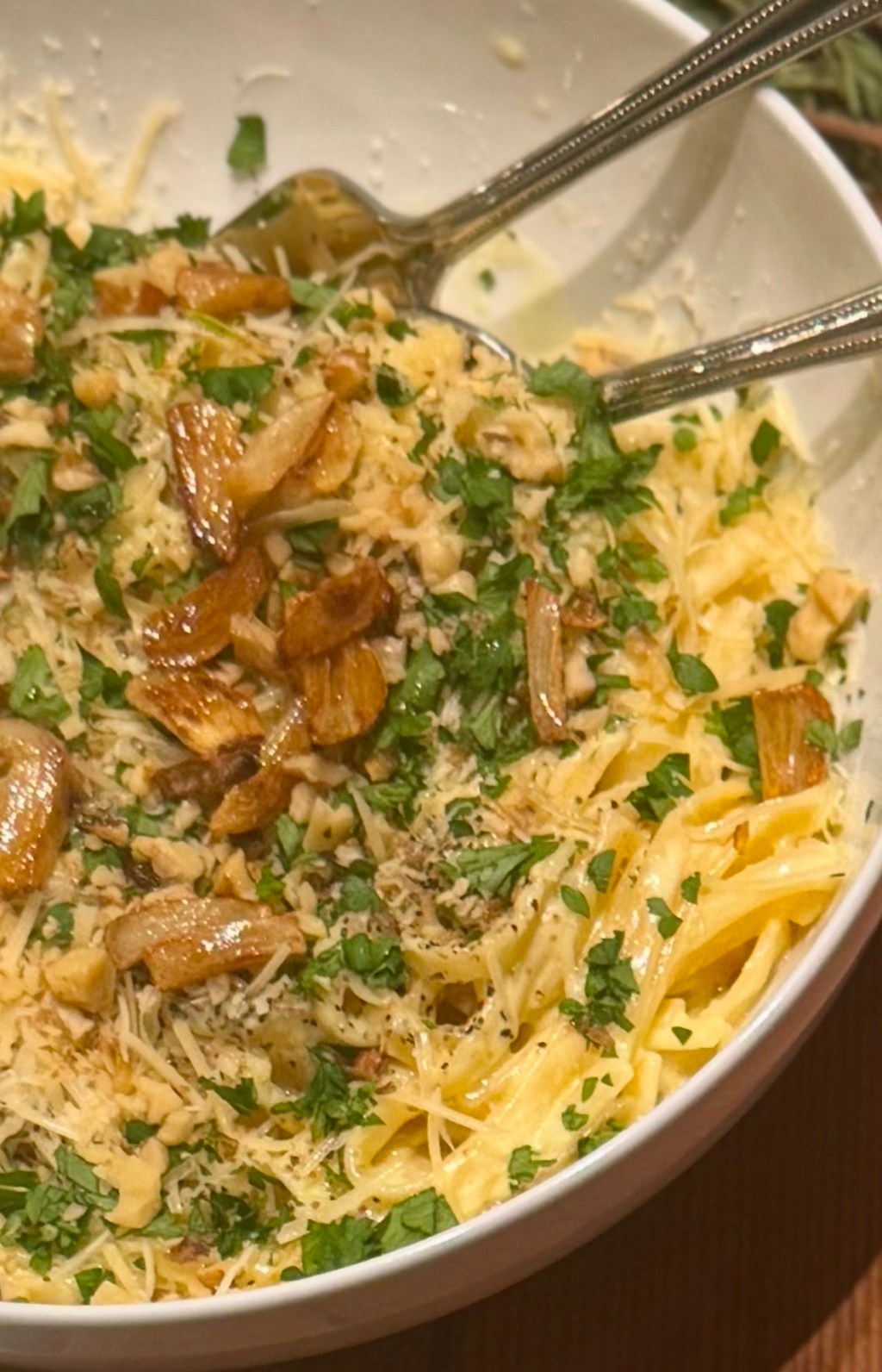 I know. I know. Skeptics everywhere … but I’m telling you, it works. And according to some Italians out there, using the pasta water for thickening is a more traditional method than using cream as the sauce is really meant to be an emulsion of the starchy water, butter and cheese. A note about the pasta … while you can try using gluten-free pasta, I don’t recommend it. You need the starch in the water and plant-based pastas don’t deliver. However, if you do want to use gluten-free pasta, use one made from corn or rice and just don’t use too much water when cooking. So, there you go. Give it a whirl. It’s easy and it’s delicious. Mushrooms and roasted garlic and fresh basil are all optional but highly encouraged : )