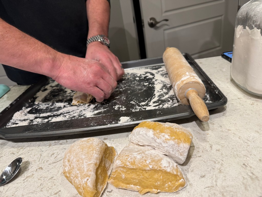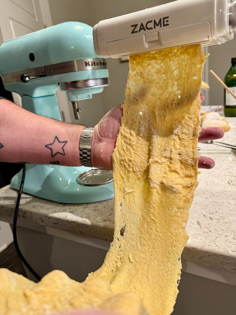 As for an official recipe, I don’t have one—we used the most basic of pasta recipes we found online. But, the key, I think, is using a quality olive oil and semolina flour IF YOU HAVE IT. But if you don’t, that’s fine, just try and use an organic, unbleached flour to keep the integrity of the pasta. And when it comes to olive oil, I’m not going to start a debate here but are those who will insist on using one with olives grown and processed in Italy. Truth be told, I’ve had some amazing olive oils from other regions, alas I’m no expert—but you can read what this Iron Chef had to say about olive oils when I interviewed him a few years ago.
