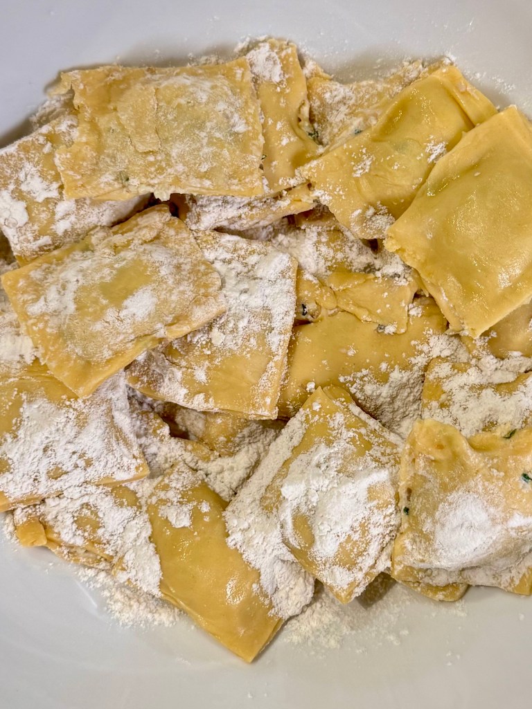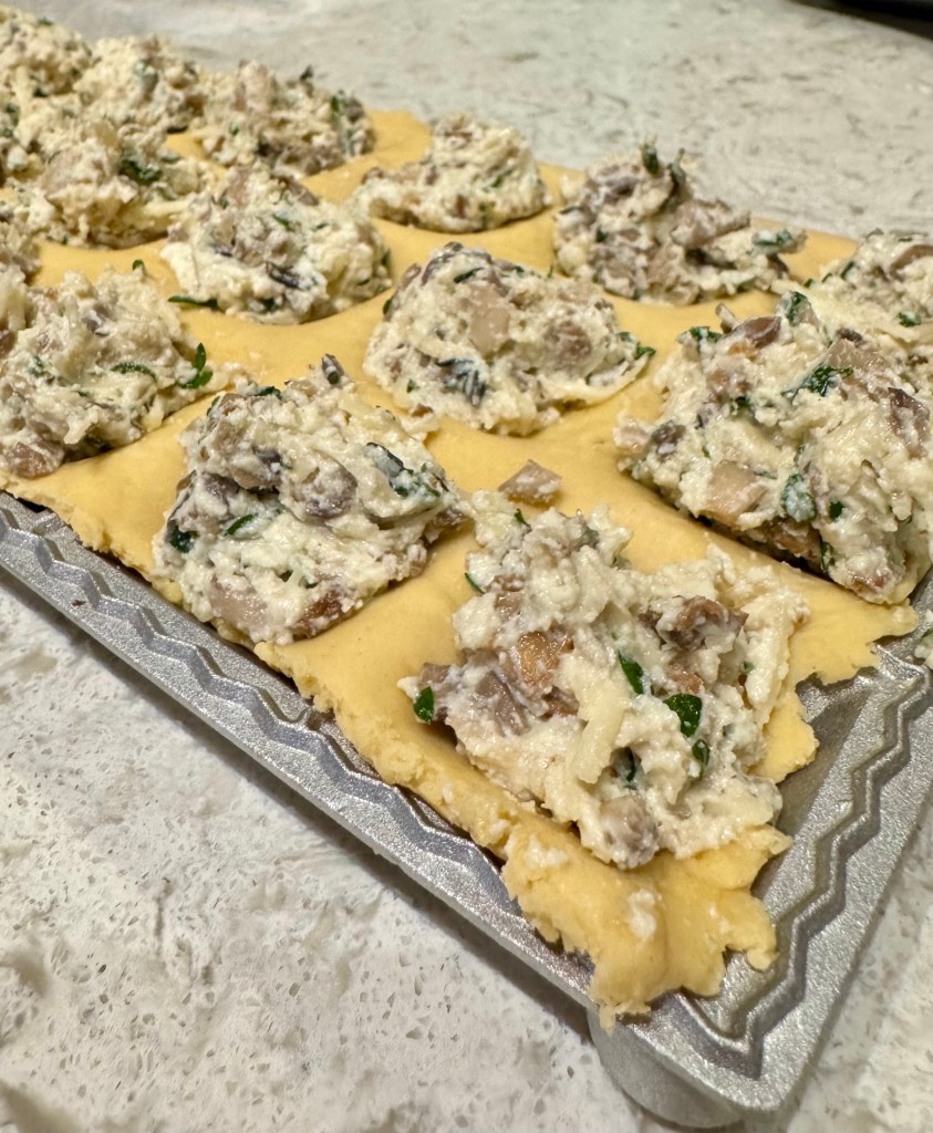 I will tell you, it’s a labor of love. You have to feed and refeed the pasta through the attachment a number of times, so I highly suggest setting a Saturday afternoon aside the first time you attempt this. As for the stuffing, you do you. We stuck with a simple mixture of: