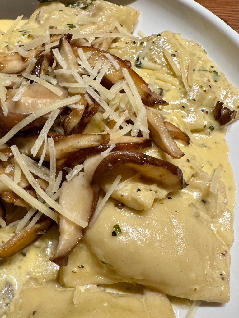 And because I love garlic and mushrooms, sauteed a whole bunch of them and added to the cooked ravioli.