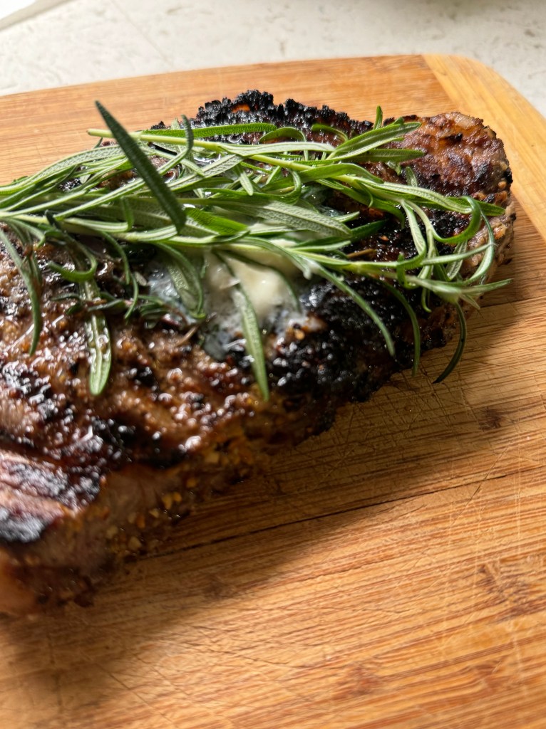 Start by sautéing garlic and rosemary (or whatever fresh herbs you want) in a cast iron with plenty of butter and olive oil, over medium heat. Meanwhile, sear your steak on a cast iron grill plate if you have one for about 2-3 minutes per side. Transfer to the cast iron pan and place in HOT oven, 450 degrees, to finish cooking. We like our medium-rare at best, so for a 2-3 inch steak, that equates to 6-7 minutes. Finish cooking on the stovetop for 1-2 minutes and continuously spoon the melted butter over the top.
