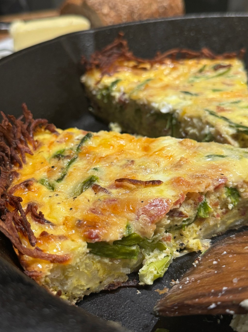 All you need are 2-3 large potatoes (we used golden), shredded (or you can cheat and buy a package of pre-shredded potatoes). Spray a cast iron skillet with cooking oil then layer the potatoes until fully covered. Bake at 425 degrees for 25 minutes or until they look “mostly” done. Remove from oven and set aside.
